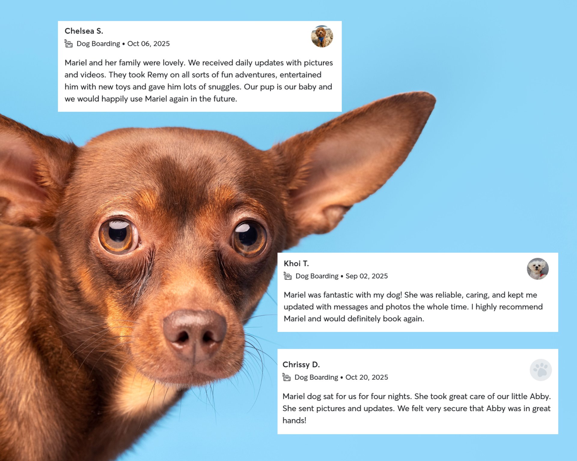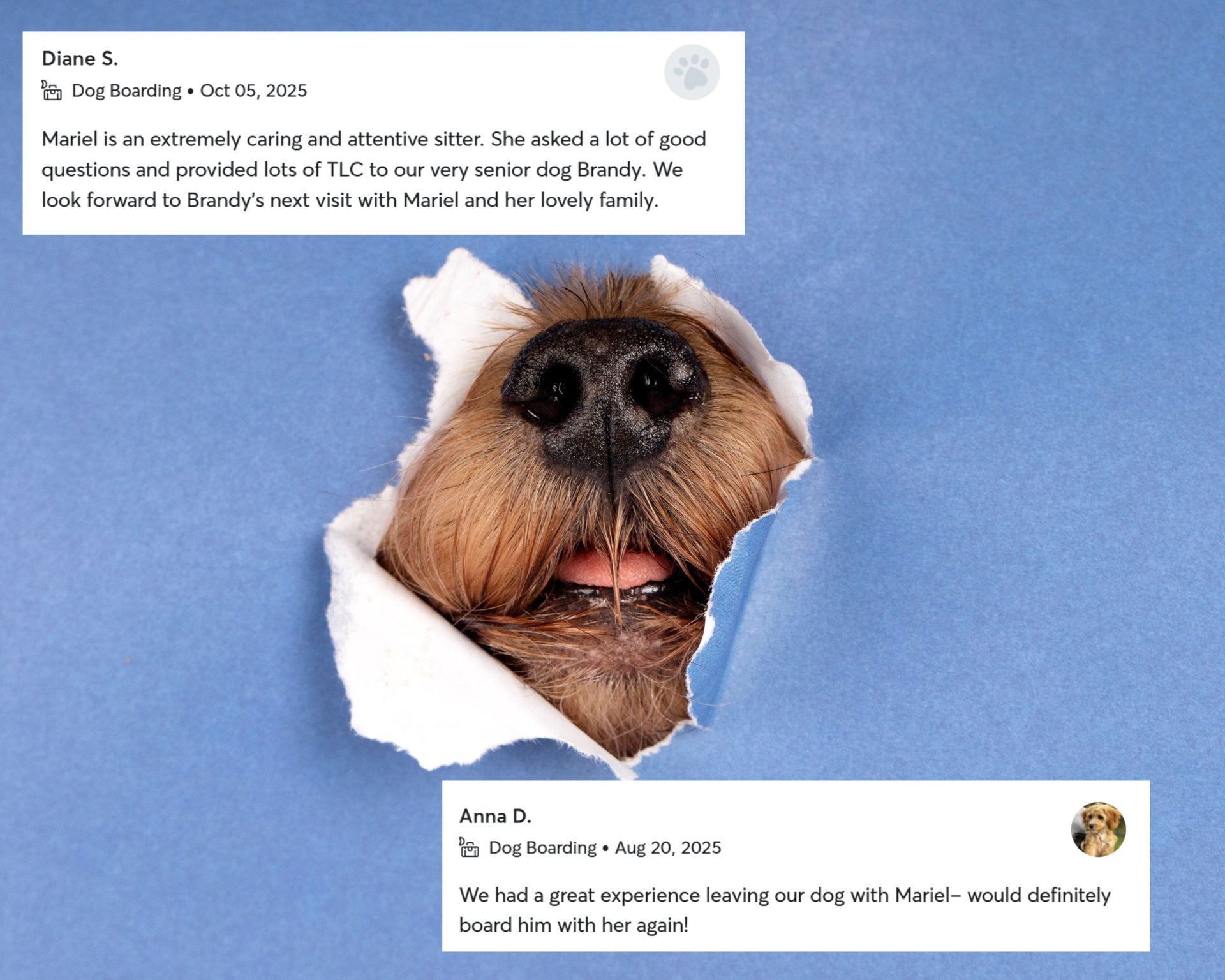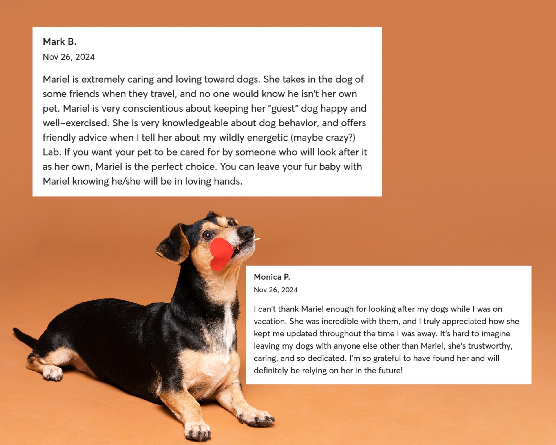 For Boarding Mariel has a Star Sitter status in Burke, VA. This program highlights responsive sitters who deliver highly rated care, have a history of listing accurate availability and preferences, making it easier for pet owners to find the best care for their dogs.